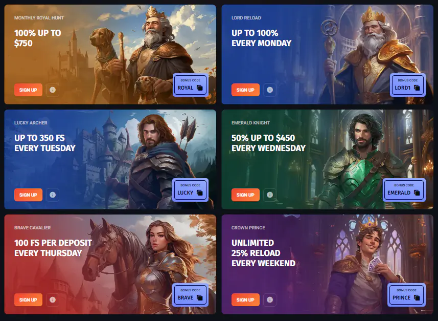 SlotLords Casino offers weekly and monthly bonuses under its Knight‑Bonuses program. Each bonus has its own bonus code, wagering limit, and schedule.