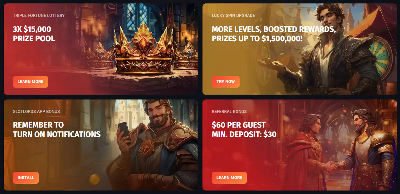 Each of these slotlords bonus offers provides different gameplay incentives — from reload bonuses to casino free spin promotions — and can be activated with the corresponding bonus code. Players must meet minimum deposit requirements and comply with general bonus terms.